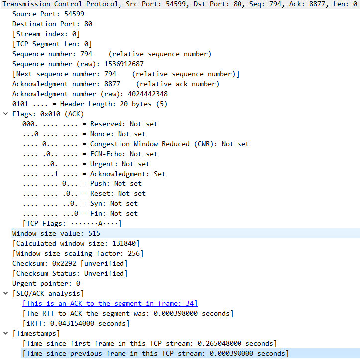 | ACK | 仅当ACK= 1时确认号字段才有效。当 ACK=0时,确认号无效,TCP规定,在连接建立后所有传送的报文段都必须把ACK置1 |