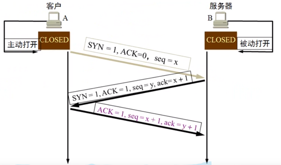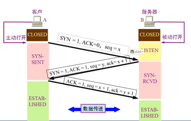 刚开始两端TCP进程都是 closed(关闭)状态。主机A作为客户端主动打开连接,主机B作为服务器被动打开连接。