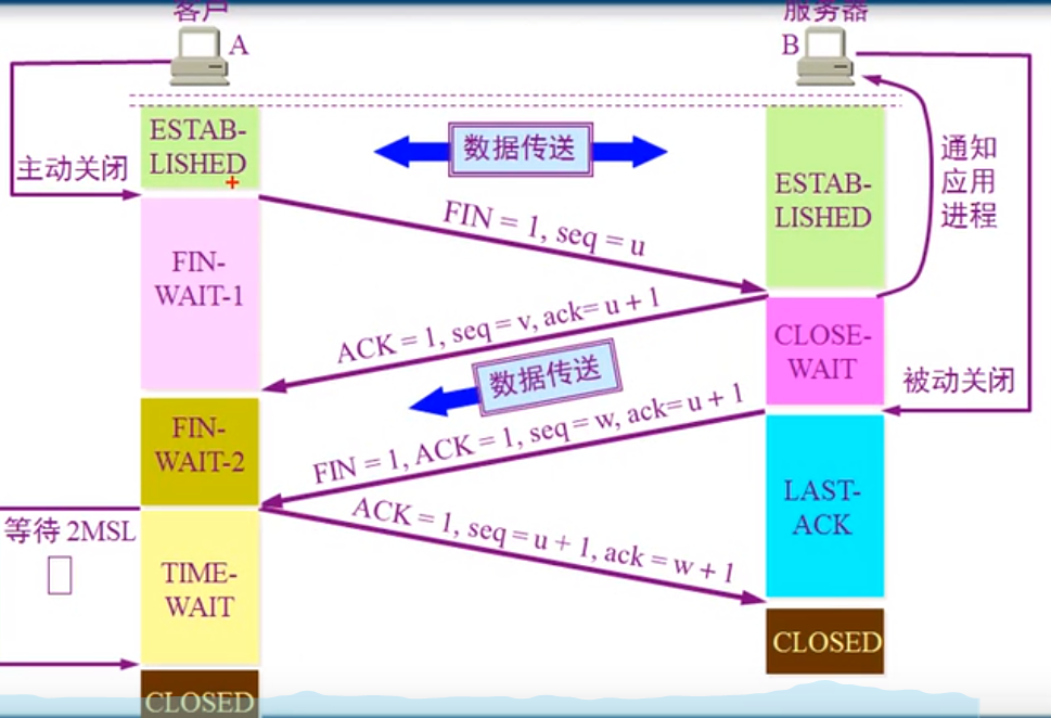 - A进程先向TCP发出连接释放报文段,并停止发数据,主动关闭TCP连接。A把连接释放报文段首部的终止控制位(FIN)置1,其序号seq=u(等于前面以传送的数据的最后一个字节序号加一)。这时A进入