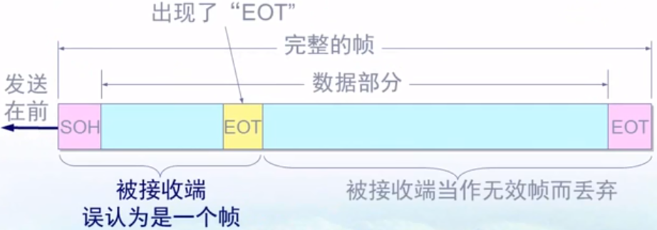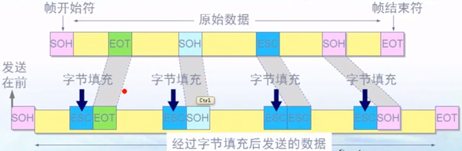 ​ 发送端的数据链路层在数据中出现控制字符”SOH“ 或 ”EOT“ 的前面插入一个转义字符”ESC“(十六进制编码 1B)